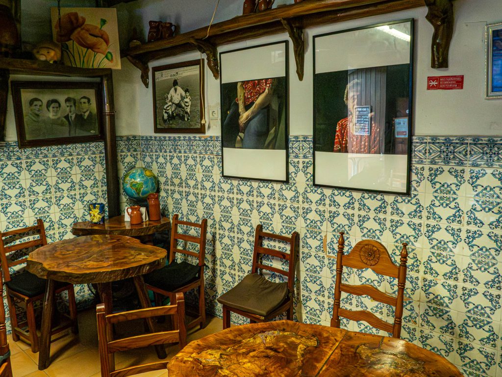 Tudo quanto está aqui, no interior, foi o meu falecido marido que fez. Trespassámos a casa, há 32 anos, e ele modificou tudo, até a posição do balcão. E foi ele quem fez estas mesas, a decoração com os barris, consertou o teto, tudo. Foi sempre tasquinha e ele é que estava aqui, porque eu tomava conta do restaurante. Aquele é que é o ‘Mata Porcos’, onde já estamos há 52 anos. Quando fomos para ali, ainda era uma tasquinha; depois é que fizemos o restaurante, deitando abaixo uma parede falsa que lá existia. Quando tomámos conta desta tasquinha, ele mudou-se para aqui.